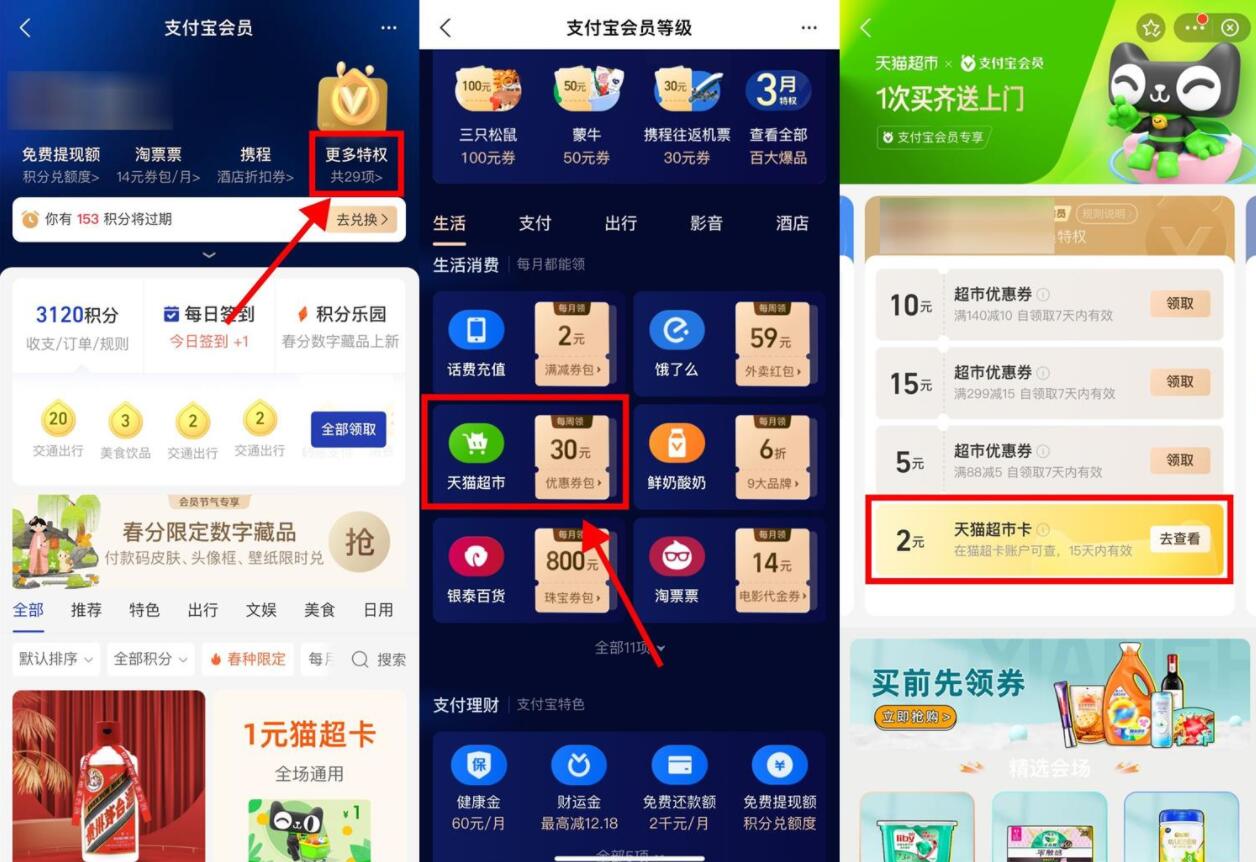 天猫超市->黄金/铂金/钻石会员分别领取2/3/5元猫超卡
