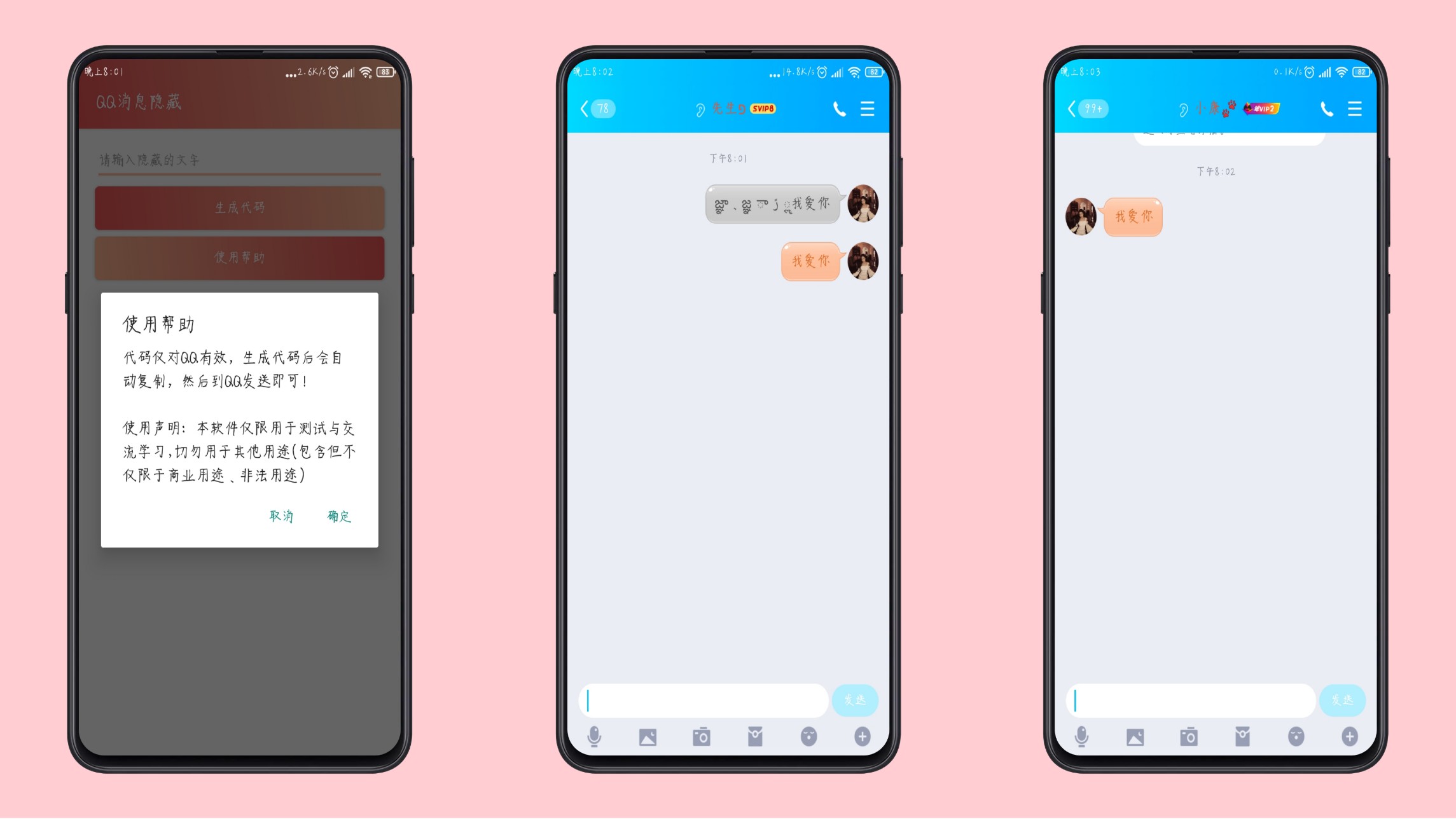 一款非常好用的QQ消息隐藏软件,软件可以帮助你隐藏聊天时候的信息,比如你要给女神发个我爱你又不敢让她看到,那你就需要这款软件加上代码之后发送消息别人也看不到消息哦!