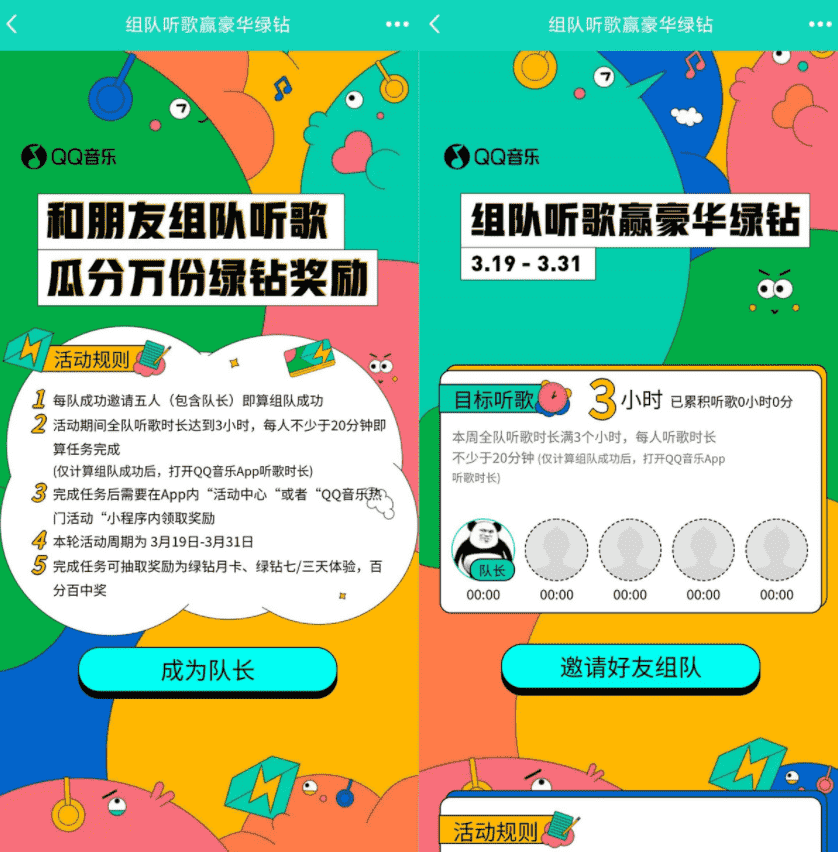 手机QQ扫码->开启自己的队伍->队伍满人后都去QQ音乐听歌->全队听满3小时算完成->完成后必中3/7/30天绿钻