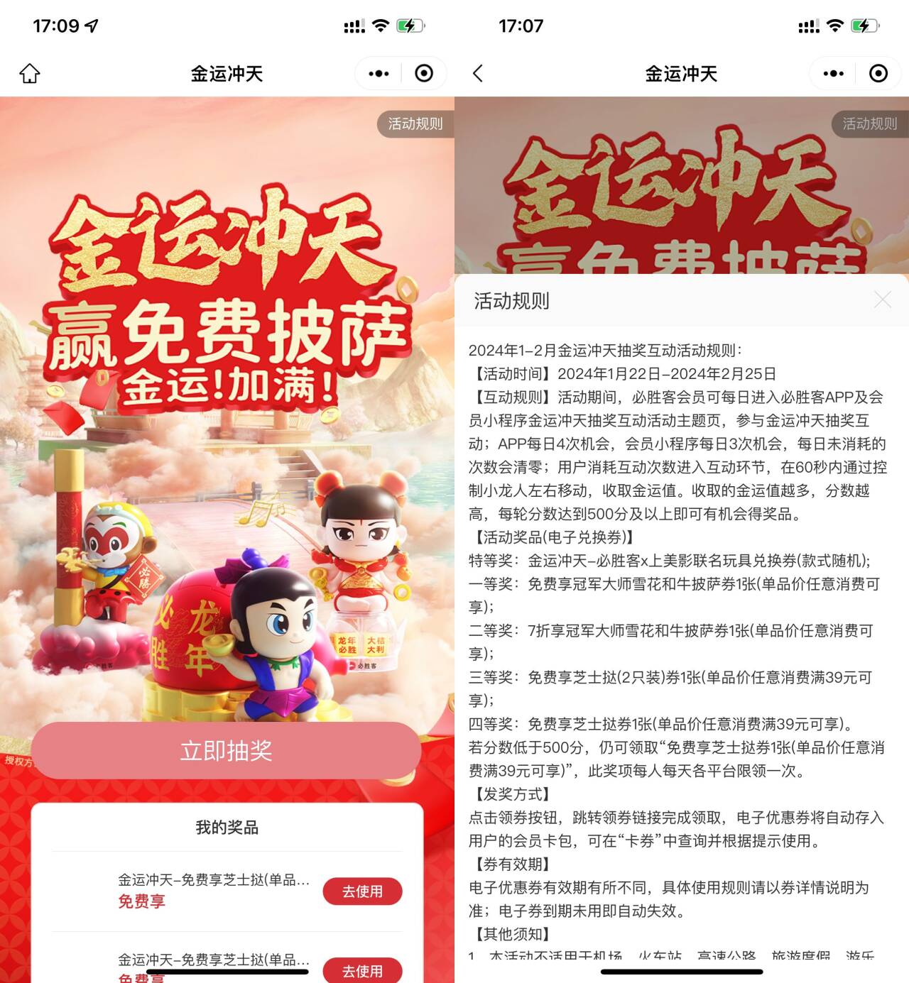 微信打开地址->每天2次机会->抽中免费披萨任意消费可用