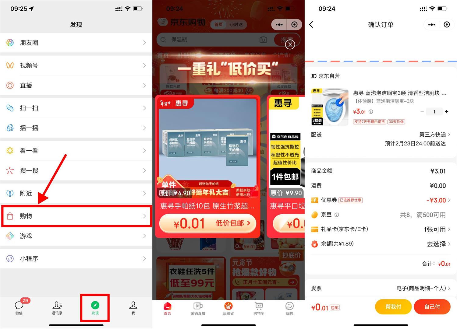 进入“微信-发现-购物”->大部分人自动弹0.01亓实物,