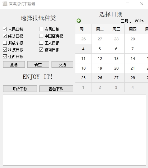 这是一款报纸下载工具,主界面是作者用QTDesigner画的,再转成py代码,方便朋友们将报纸保存到本地并查阅。软件可以自定义勾选需要下载的报纸,也可以自定义需要下载的时间,下载的报纸按种类保存在一个单独的文件夹内,并点“查看下载”方便打开阅读。