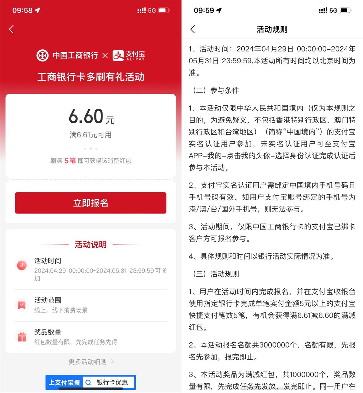 支付宝APP扫码->先去报名一下->然后工行消費5次5亓以上即可得6.6亓消费红包,限量100万份