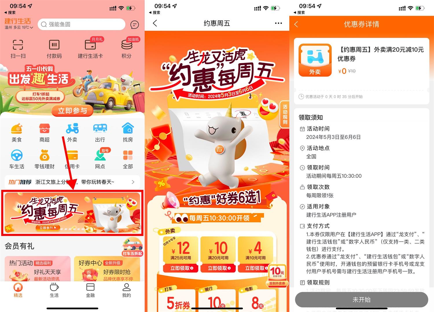 建行生活APP->约惠每周五->直接领10-4亓外卖满减券