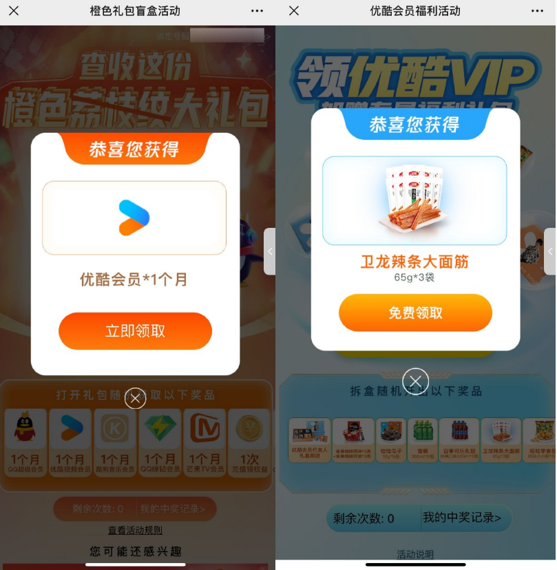 有点绕 自己琢磨,活动1没中优酷会员的话 就兑换不了活动2的实物