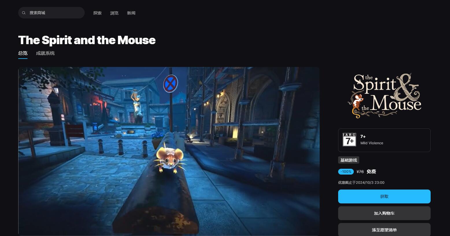 领取地址:https://store.epicgames.com/zh-CN/p/the-spirit-and-the-mouse-42390b