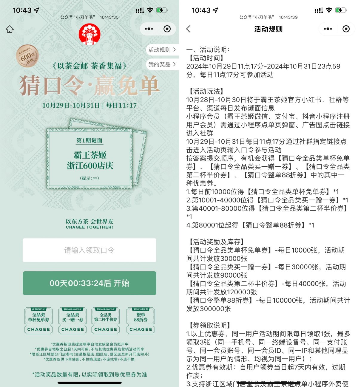浙江霸王茶姬猜口令得免单券