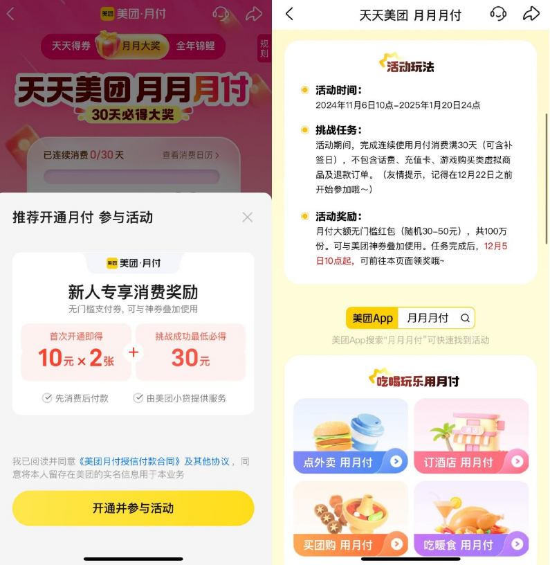 美团APP搜索“月月月付”->首次开必得2张10亓支付券->