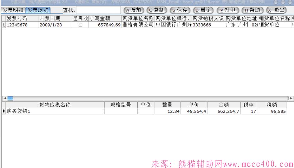 飞速增值税发票、销货清单打印软件,完全支持发票套打,打印发票清单,A4纸打印等,大小写金额自动计算生成,用户自已可以导入发票格式模板进行打印,可以自行设置,打印位置,字体大小、字符间隔大小,可以导出发票资料为Excel、PDF、JPG、BMP文件等。