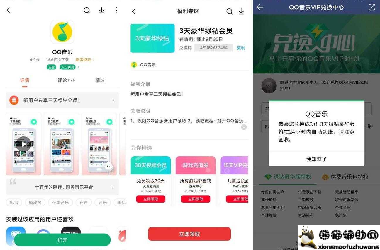 步骤:打开小米应用商店搜索“QQ音乐”->进去后点中间横幅新人专享3天->下载领取->给的是兑换码->老用户也可以兑换