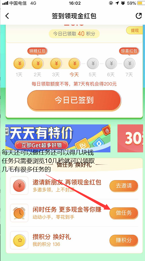 4、返回app首页还可以进去签到活动里,每天签到也可以领取到一个随机金额的现金红包