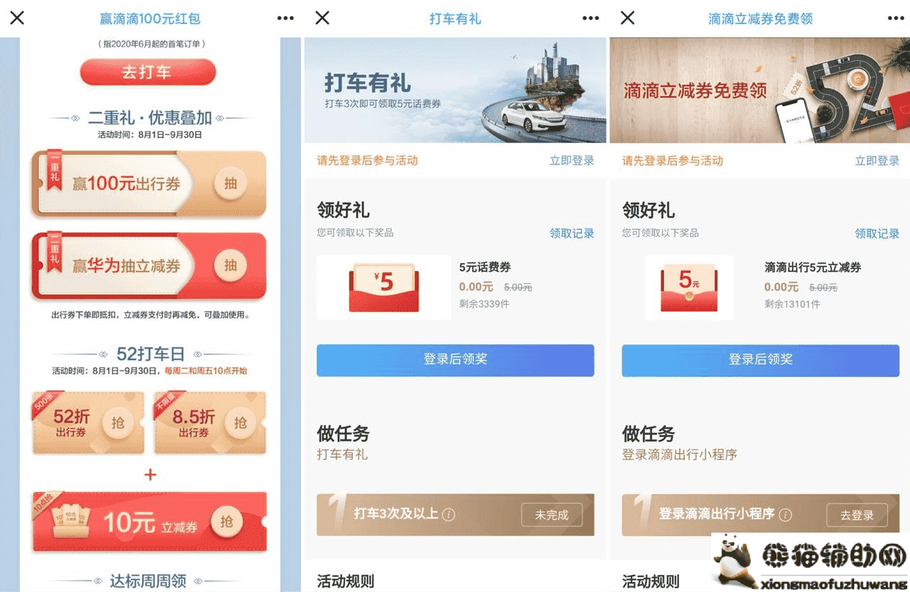 活动1页面下拉多个活动抽滴滴券->活动2直接领5元无门槛滴滴打车券->活动3累计9月在招行APP打车3次可以领5元话费券满10可用