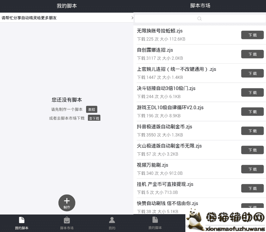 可以自己录制脚本,自带的脚本市场里面可以下载别人制作的脚本。