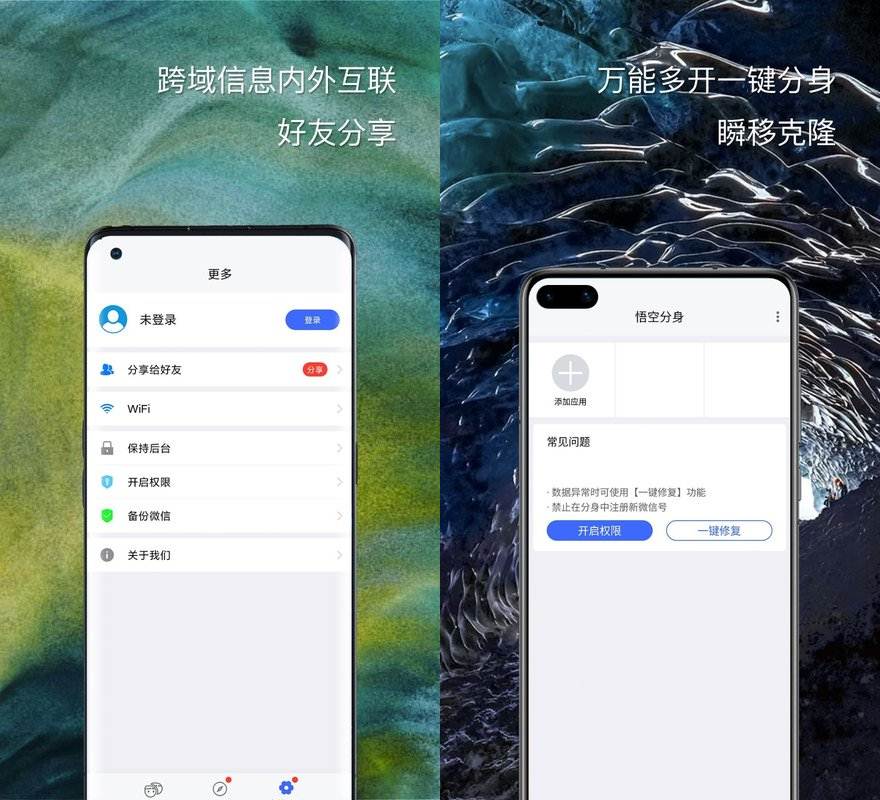 悟空分身,不收取任何费用,支持微信分身版多开分身工具,支持虚拟化启动官方正版微信,安全不封号,集多开分身放桌面、无限多开分身等功能,实现一部手机微信双开,甚至多个微信分身版同时在线。一键实现微信双开助手、微信分身版、微信多、国寿e店、人保e通(健康险)、泰行销、秘乐短视频、球球大作战等多开分身