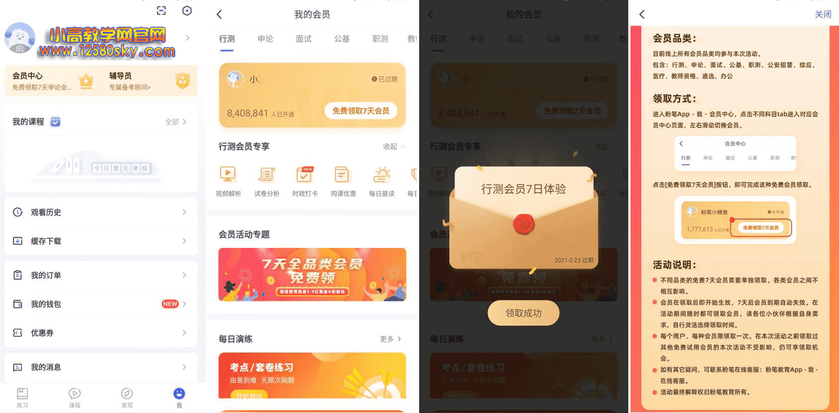 下载粉笔教育APP->登录后->我->左上角->会员中心->进来就可以看见免费领取7天会员->领取即可