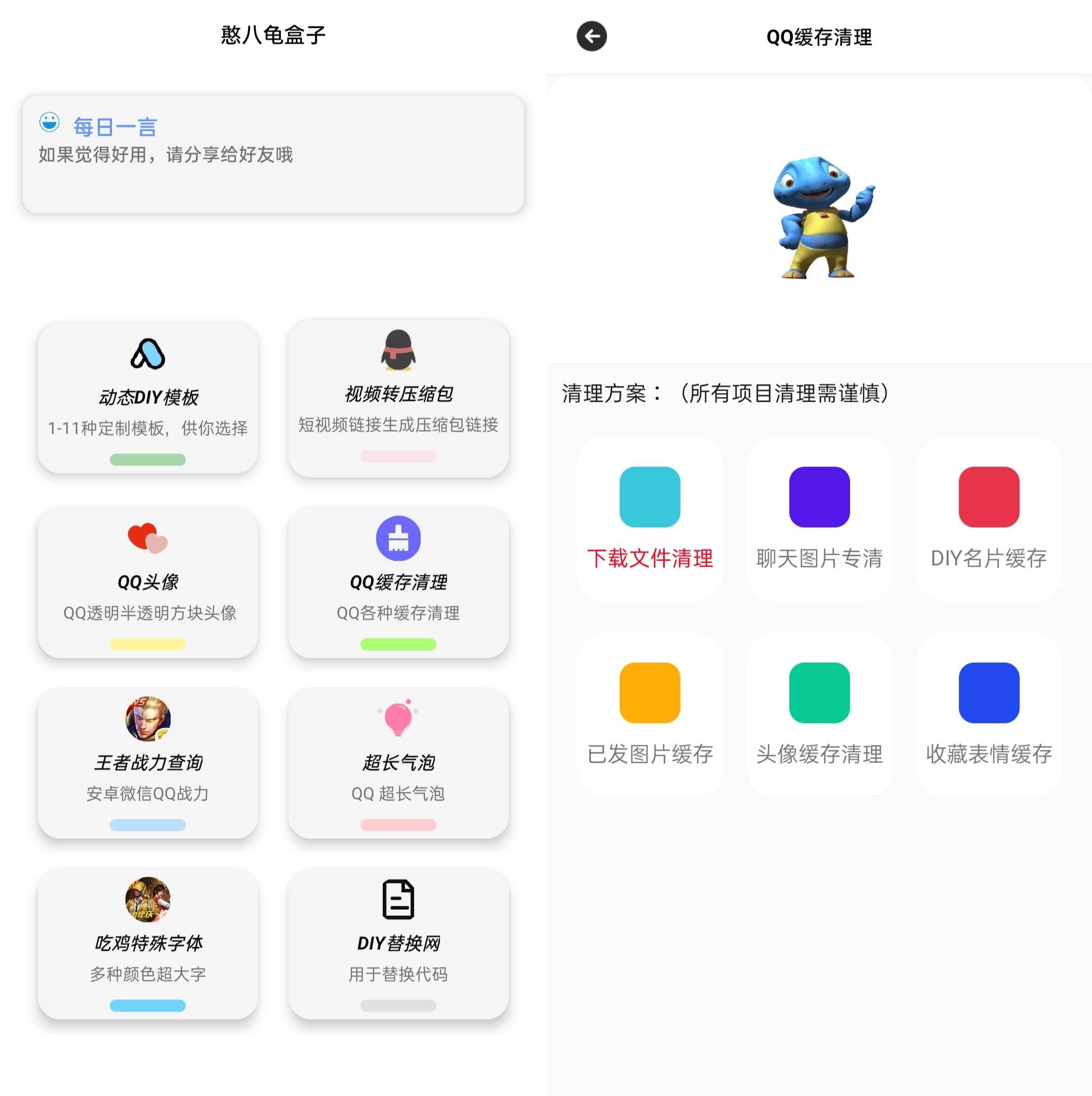 功能:DIY定制模板生成,视频转压缩包链接,透明,半透明,方块(真正意义的方块)头像,QQ缓存清理,王者战力查询,超长气泡,吃鸡特殊字