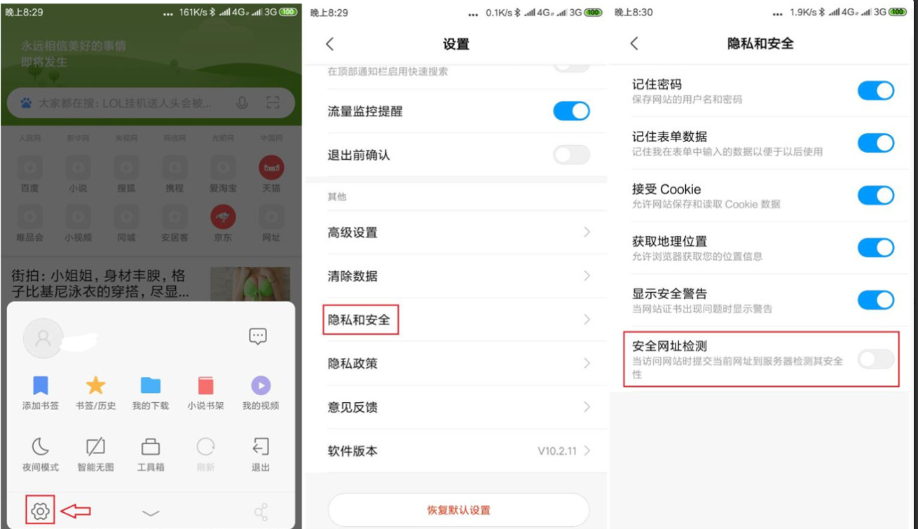 检测方法:打开小米浏览器->设置->隐私和安全->关闭安全网址检测即可
