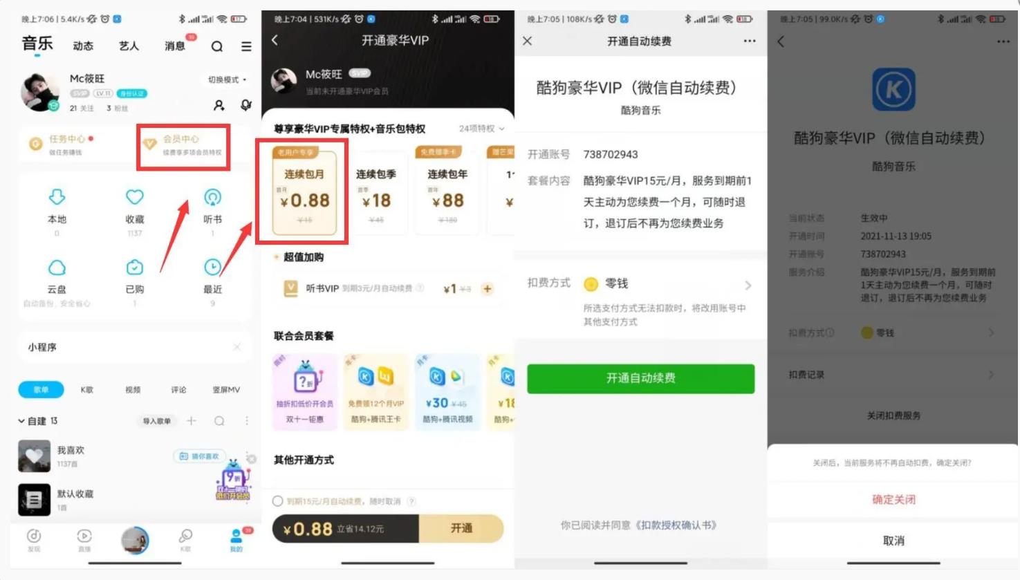 打开酷狗音乐APP->进入会员中心->续费如图显示低价就开通->然后到微信关闭自动续费!