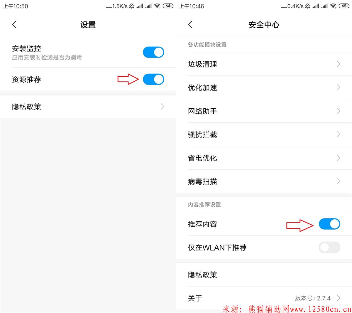 3、垃圾清理:设置→系统应用→安全中心→垃圾清理→关闭“资讯推荐”。