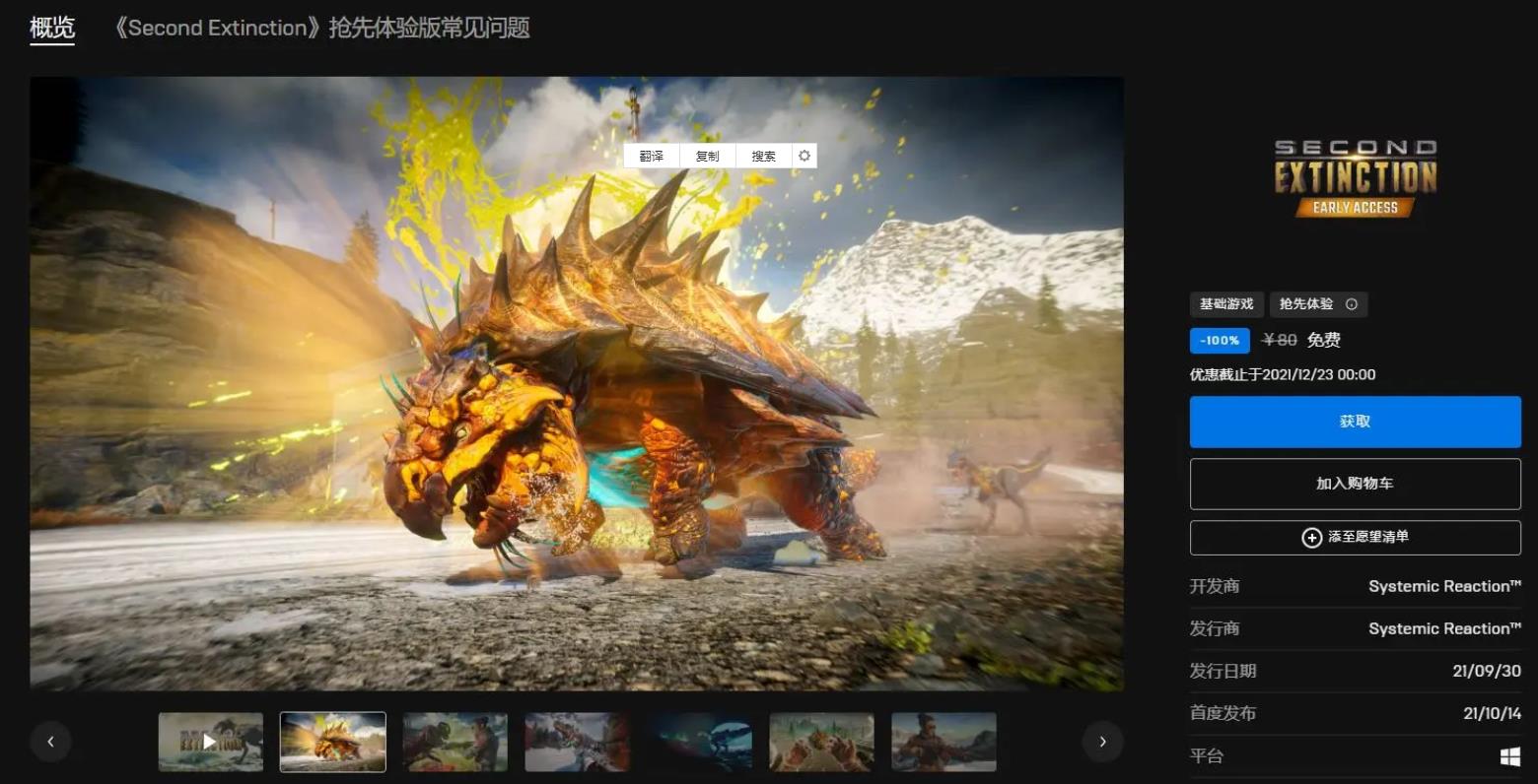 领取地址:https://www.epicgames.com/store/zh-CN/p/second-extinction