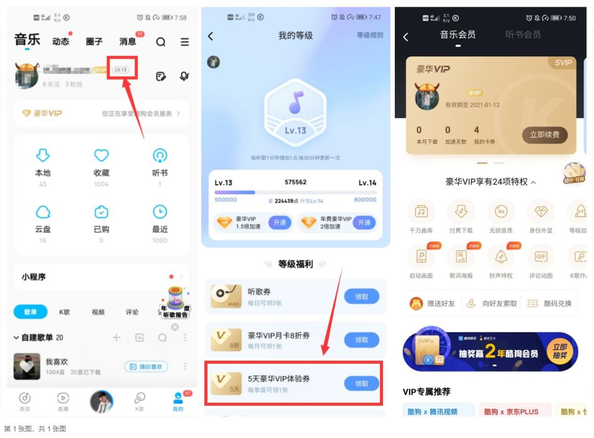 打开酷狗音乐APP->我的->点顶部等级图标->进来后下拉页面就可以看见->5天豪华VIP体验券->领取秒到账