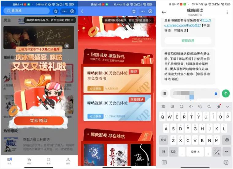 1、’支付宝搜索“咪咕阅读”->进入小程序->点击弹窗进入