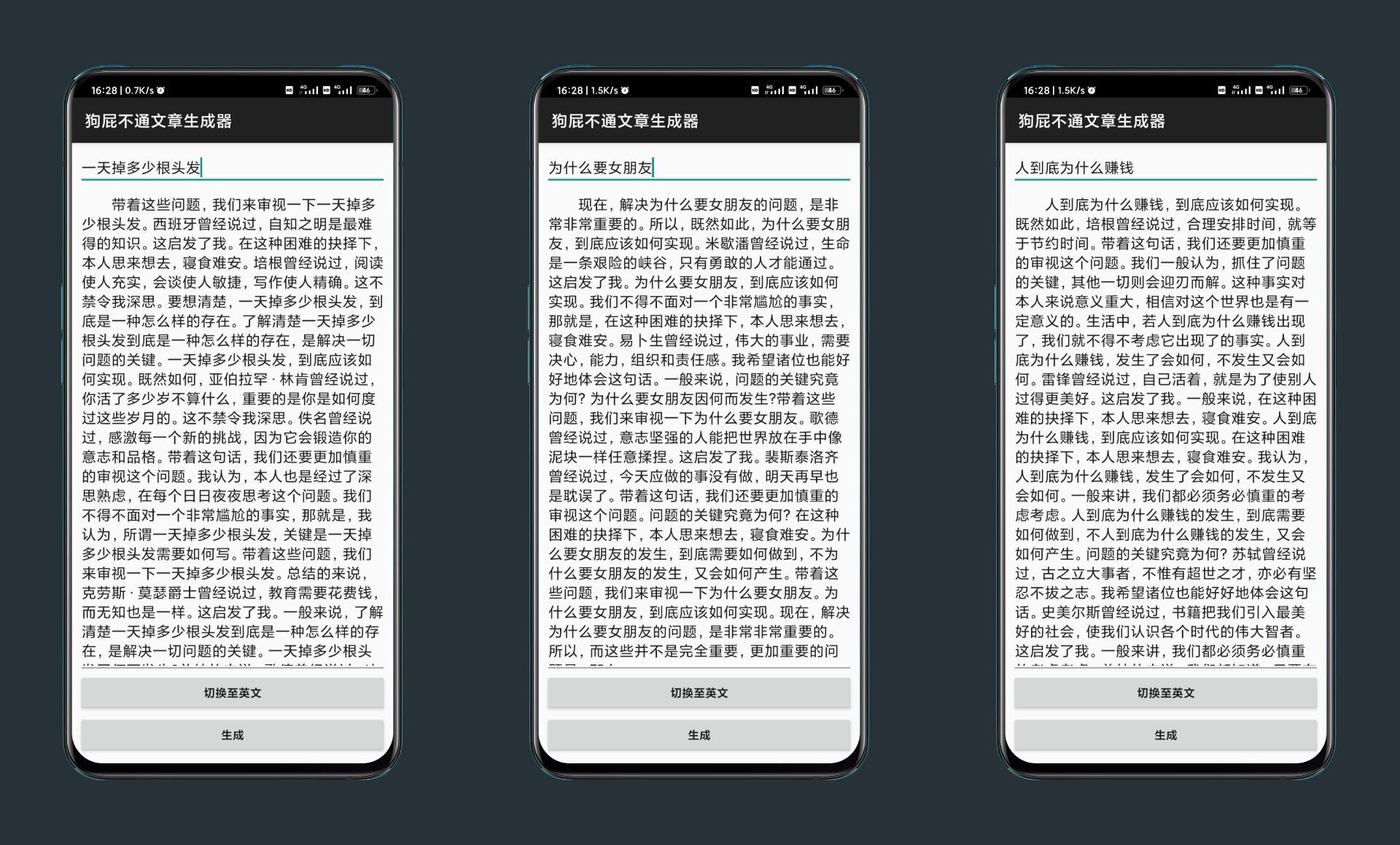 官方介绍:一款非常有趣的软件,您只需要在里面输入你感兴趣词语就会为您生成一段长达万字的文章,也就是人们常说的狗屁不通文章。也许生成的文章没有什么实际用途更加谈不上文学价值,但用来恶搞还是绰绰有余的,新版添加英文文章生成!