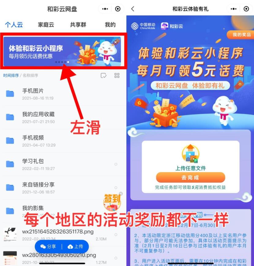 微信小程序搜索“和彩云网盘”->进来点我的登录后->看首页顶部有没有领取流量话费活动->有就依次全部参加完