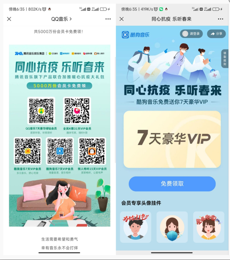【免费领各大APP会员7天】同心抗击疫情,宅家听歌!