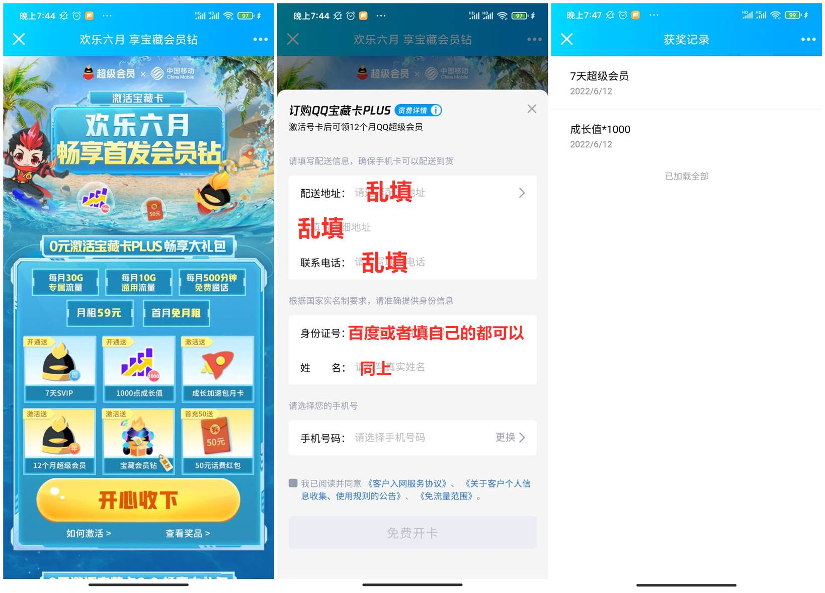 2、点击免费开卡->自动到账7天超级会员和1000成长值