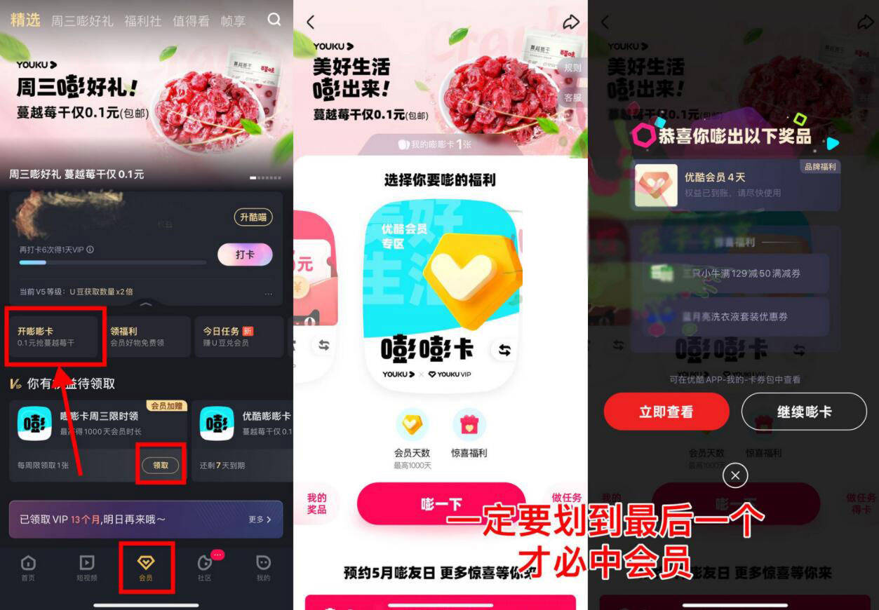 2、周三嘭好礼->U豆兑换一张嘭嘭卡->左滑到第二个->然后嘭一下点两次->必中优酷会员