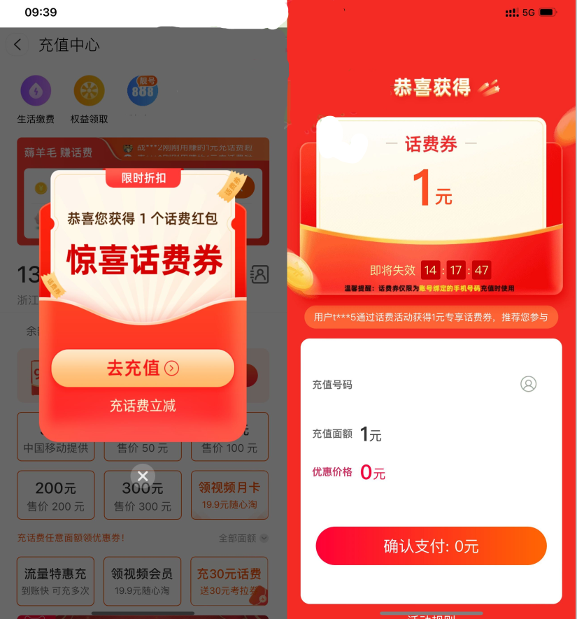 2、部分地区电信和联通用户0~0.2元充1~2元话费