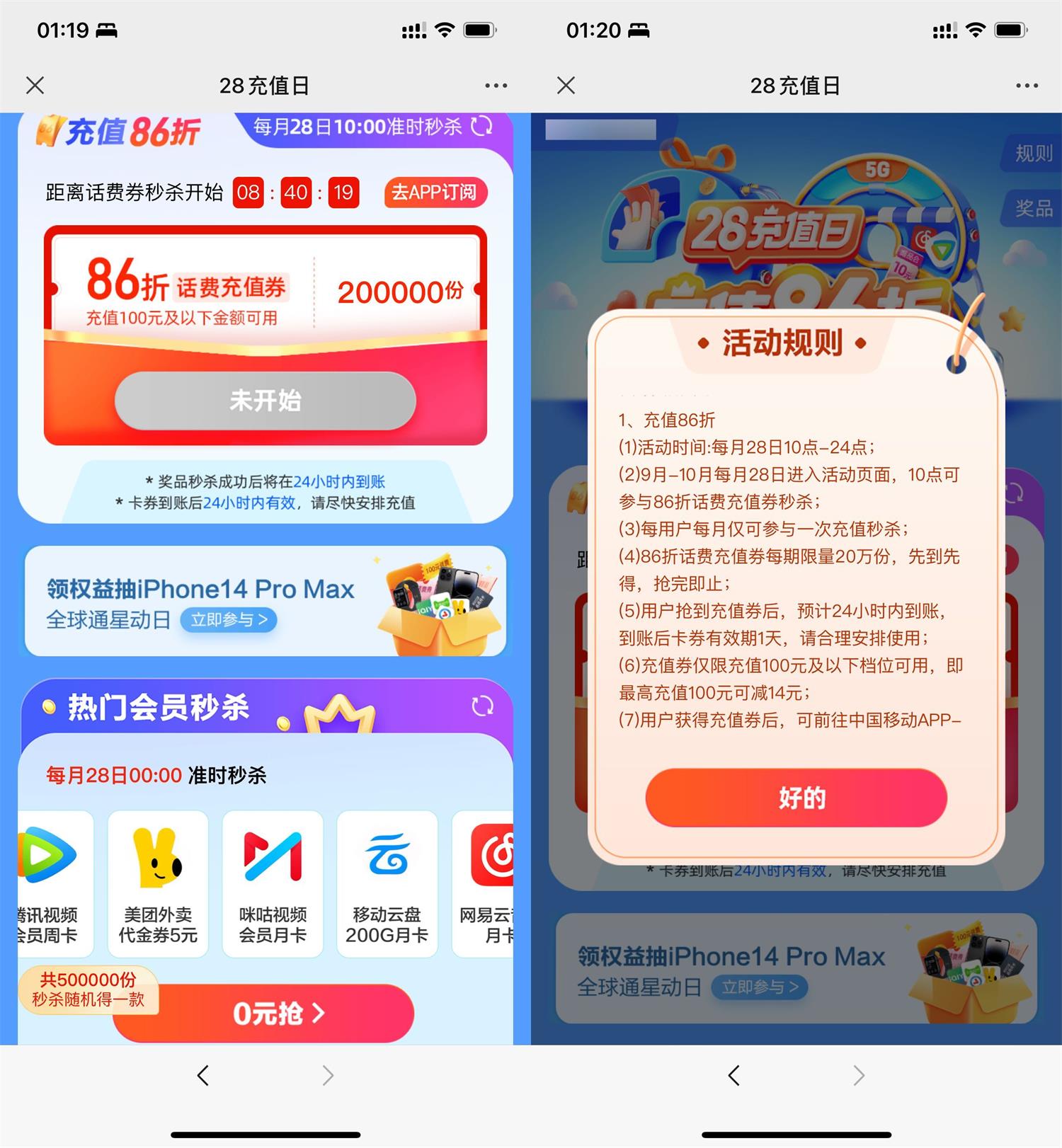 微信打开地址->10点整抢86折话费券,限量20万份->下拉还有0元抽影音会员美团券等