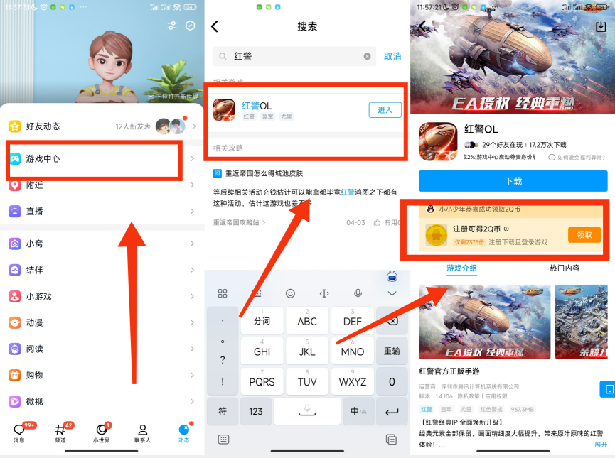 打开手机QQ游戏中心、搜索“红警”新用户注册领2Q币!
