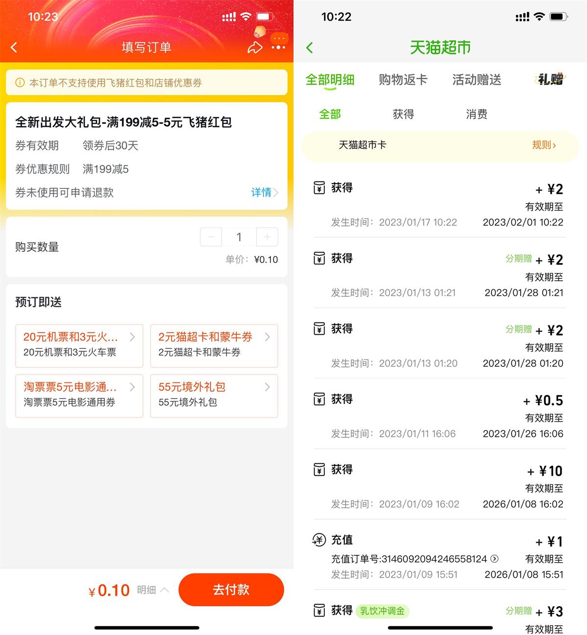 淘宝APP扫码->花0.1元买自动赠送2元天猫超市卡和5元淘票票通用券