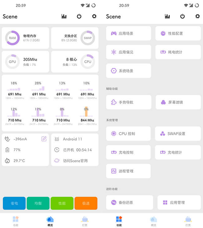 Scene(骁龙工具箱)是安卓系统辅助工具应用,简洁的界面加上简单的设置,这是一款在原微工具箱基础上做一些调整,改成动态响应、自动行为以及特殊权限管理等,内核调校,可以调节CPU的频率,针对某些场景自动调节CPU,达到省电和提高性能。需要ROOT。