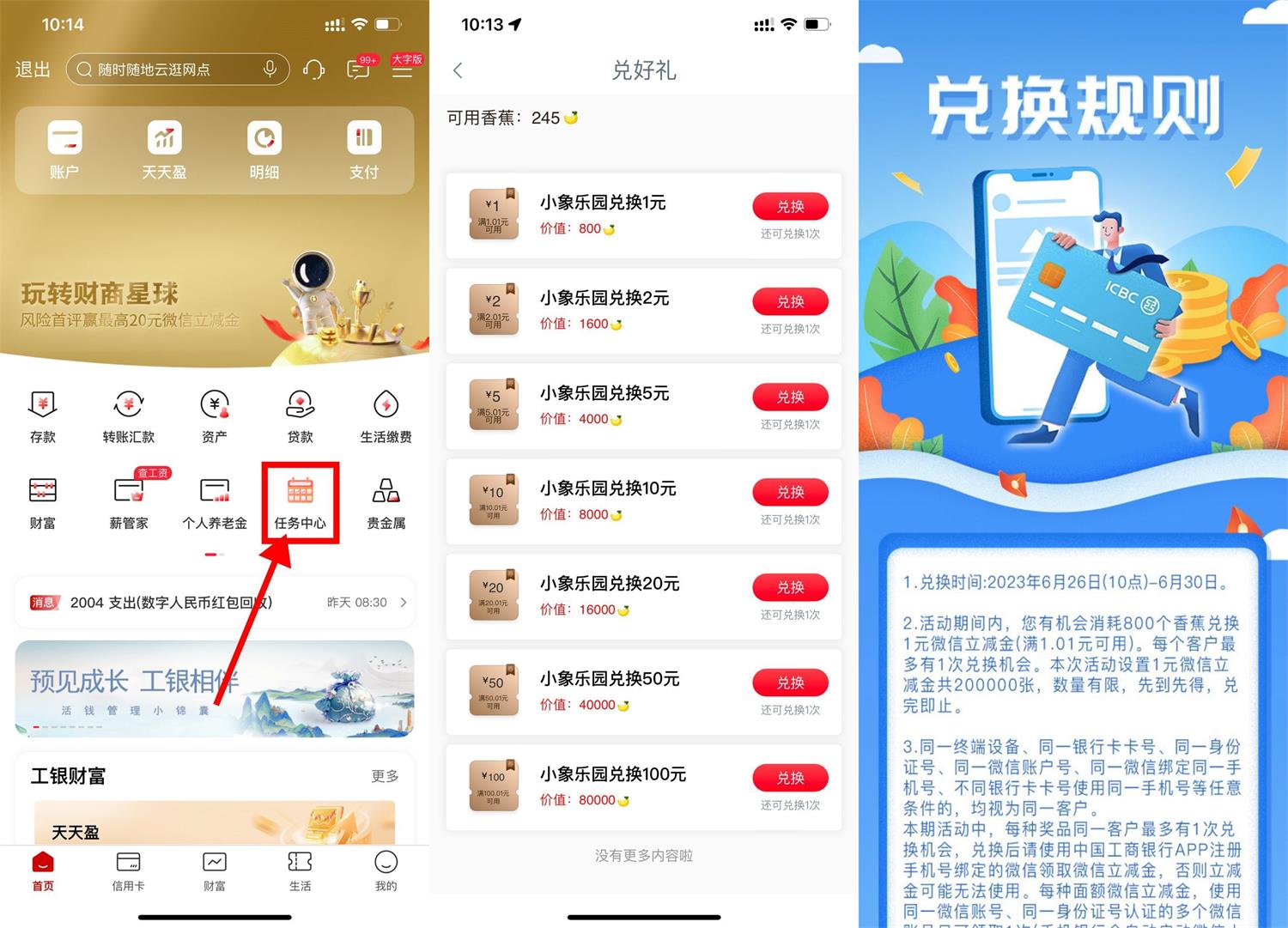工行APP搜索“任务中心”进入->签到和做任务得香蕉->
