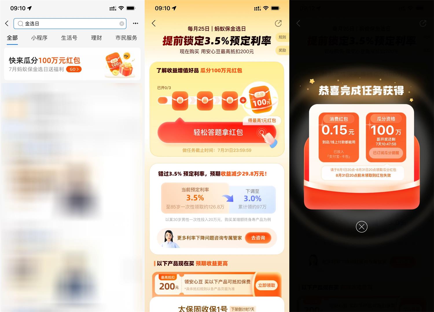 支付宝搜索“金选日”->点击横幅进入->简单浏览通关3关得随机消费红包,在8月1日20点再瓜分100万消费红包(上一期每人瓜分了5元以上)