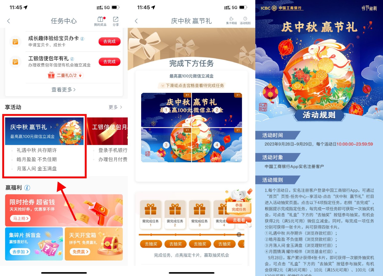 工行APP搜索“任务中心”->庆中秋 赢节礼->简单浏览得5次机会抽2~100元微信立减金