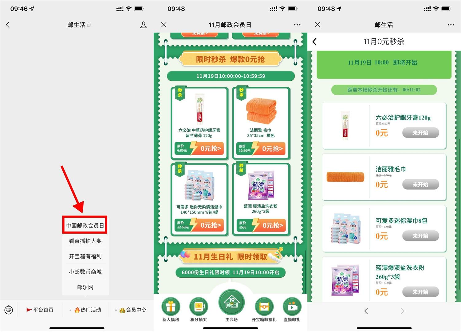 微信关注公众号“邮生活”->菜单栏“热门活动-邮政会员日”->今天10点准点抢实物,大概1分钟内抢完(本月生日的用户还能抢生日礼)