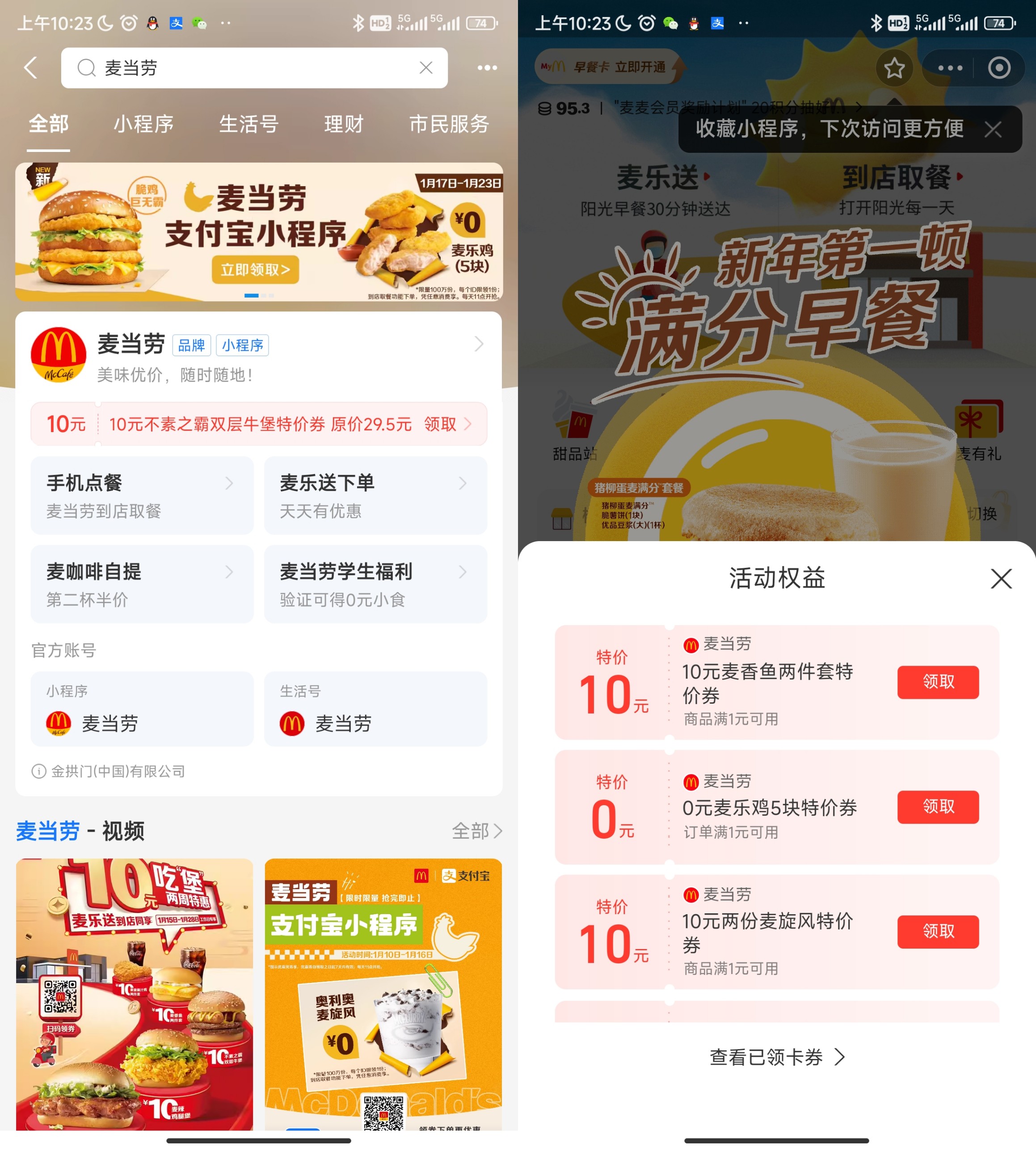支付宝搜索“麦当劳”->点击横幅进入直接领->