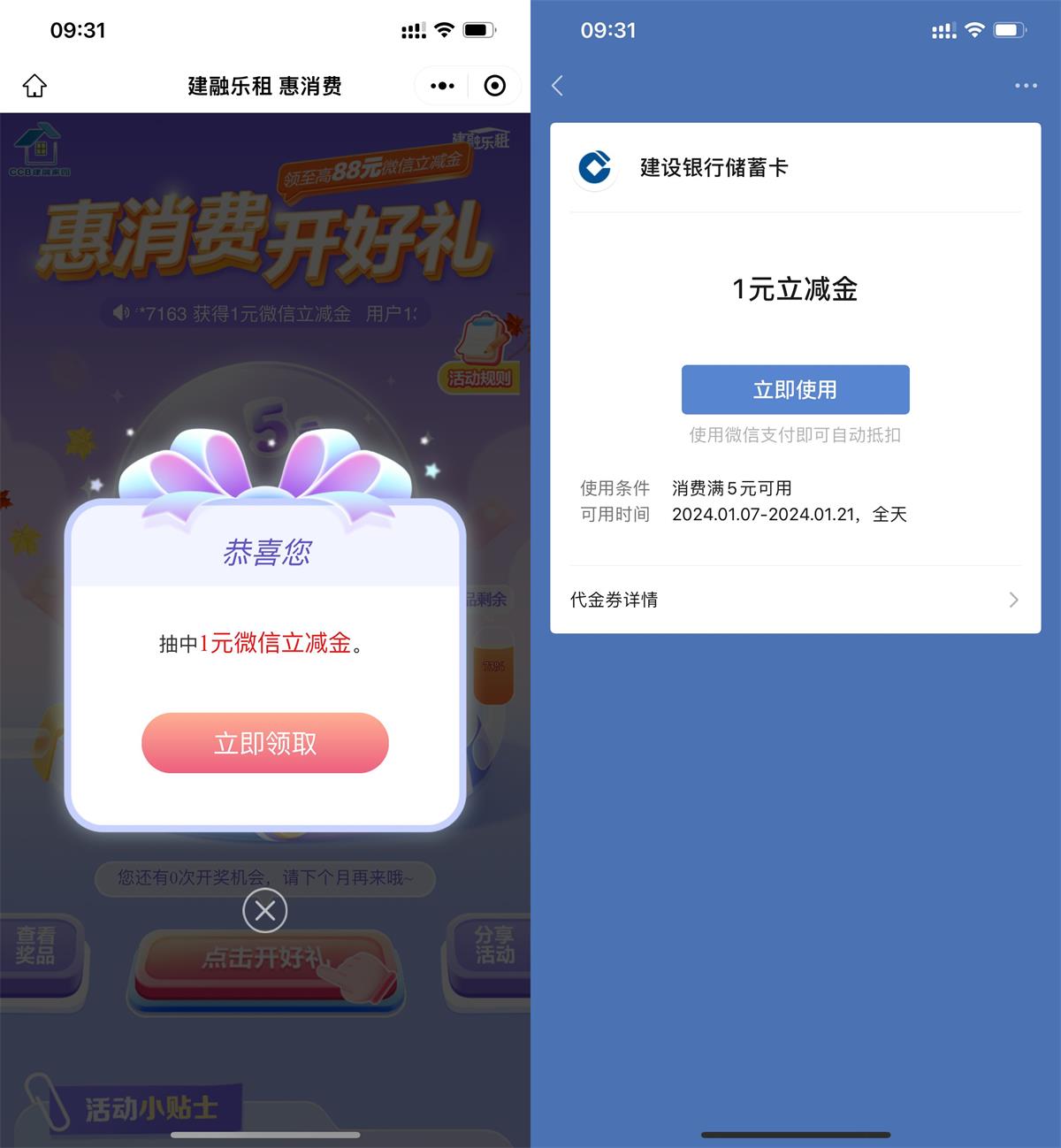 微信进入小程序“CCB建融家园”->惠消费开好礼->直接抽微信立减金->跳转到建行小程序领取秒到