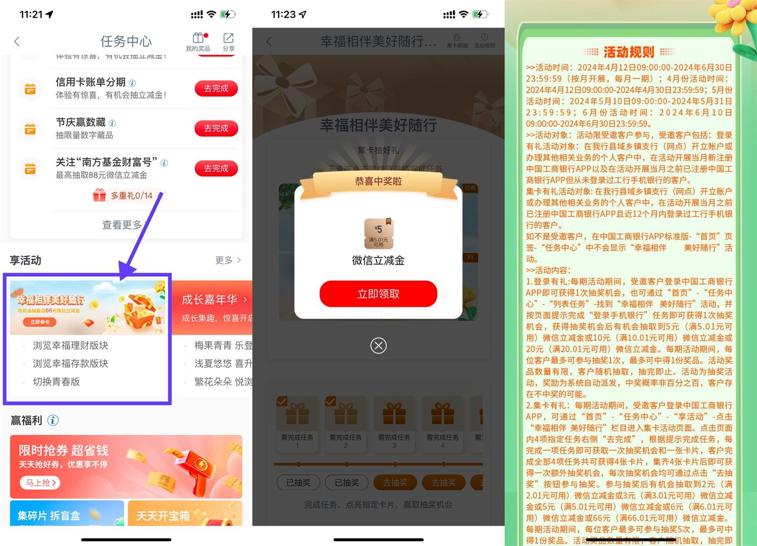 工行APP搜索“任务中心”->幸福相伴美好随行->简单浏览集卡抽5~20亓立减金