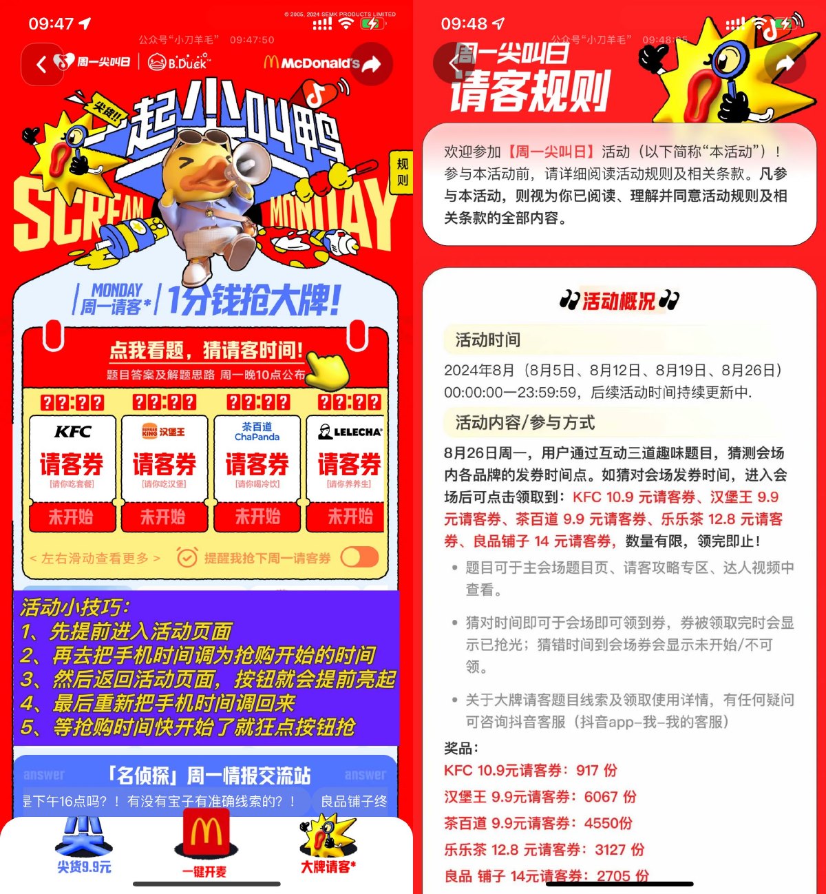 抖音APP搜索“周一尖叫日”->指定时间抢请客券,可0.01亓买美食(根据图1的小技巧来比较简单)
