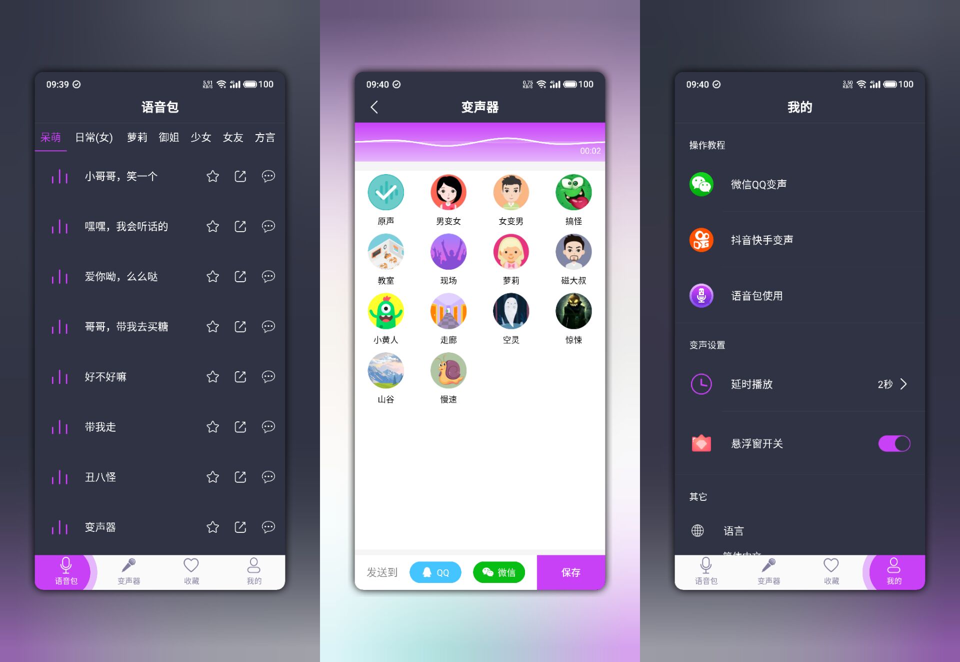 自带的语音包功能,给你更多创造灵感,成套语音,让你完美伪装,对答如流。悬浮窗功能,让你轻松实现微信、QQ等聊天软件中的变声,各种游戏中变声也是不在话下好玩又有趣哦!