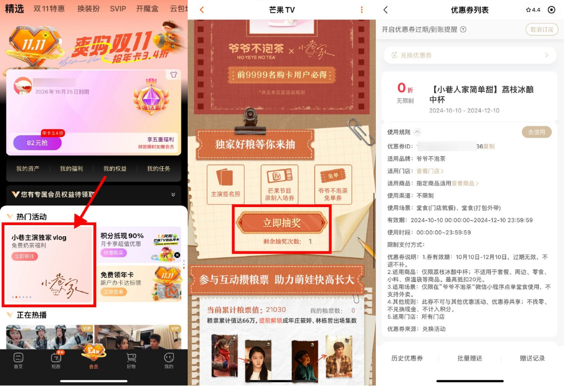 芒果TV APP底部“会员”->轮播图“小巷主演独家vlog”->