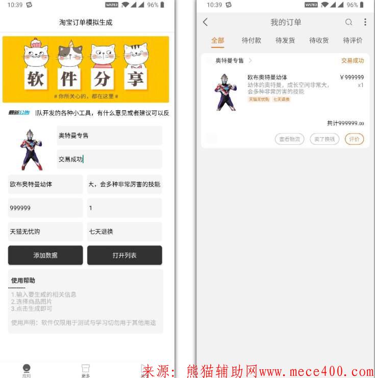 一款超级牛逼的伪造淘宝APP订单软件,用户只需要输入对应的内容就能一键生成订单记录。可以适当恶搞或者装逼