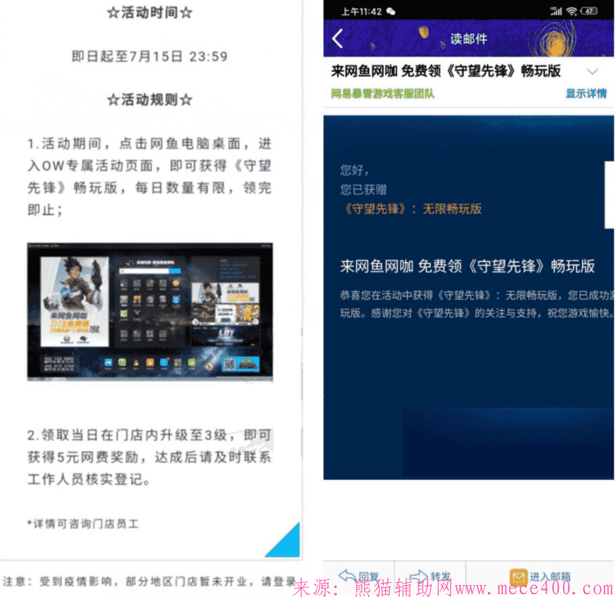 前往网鱼网咖线下门店,点击位于电脑桌面的活动页面,按照指示完成领取步骤,即可获得《守望先锋》畅玩版