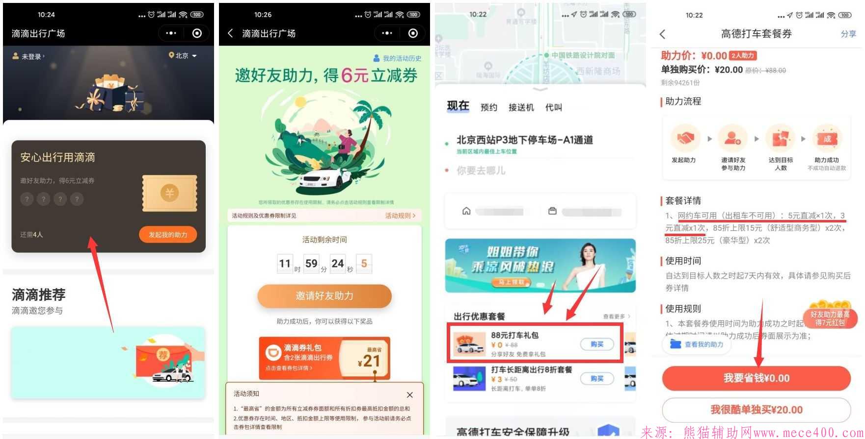 微信小程序搜索“滴滴出行广场”->点首页中间“安心出行用滴滴”->发起助力->邀4人助力即可领6元无门槛打车券