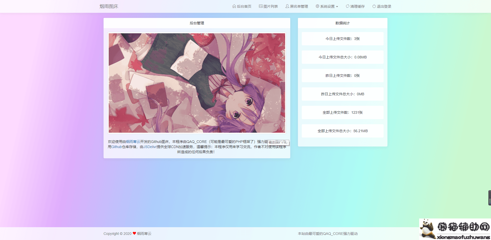 烟雨图床程序这是我目前为止看到的唯一一款开源的既可爱又简洁的图床程序了,它基于烟雨写的QAQ_CORE开发,采用MVC架构编写而成,使用Github进行文件储存,由JSDelivr提供全球CDN加速服务,它很可爱。她很美…